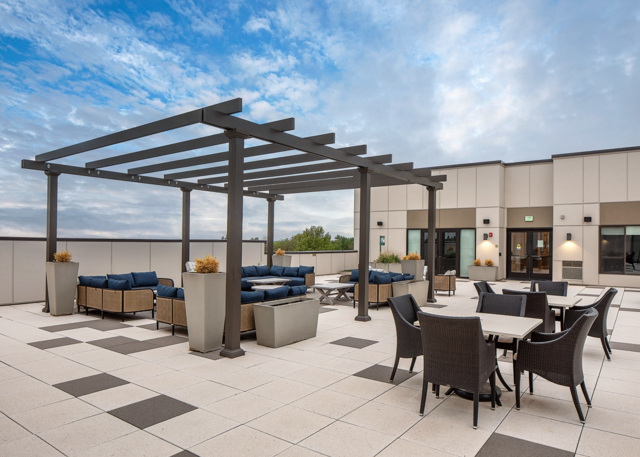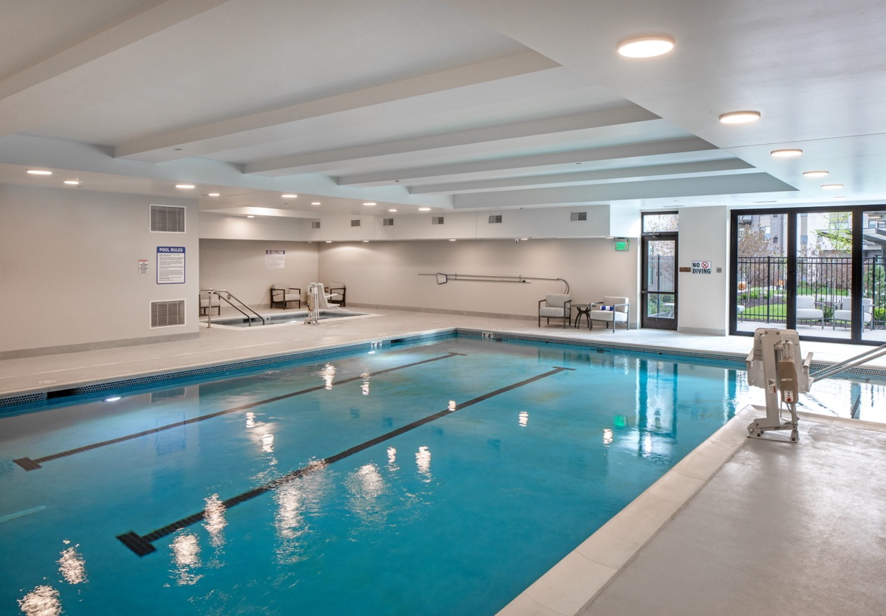 The Ovation Heartwood Preserve campus features two distinct buildings, each tailored to meet the diverse needs of its residents. Ovation Heartwood East is a 202,000-square-foot independent living facility that promotes wellness, connection, and an active lifestyle. It includes a high-efficiency variable refrigerant flow HVAC system, a commercial kitchen, and dedicated physical therapy and rehabilitation spaces. Residents enjoy a full-service salon, spa, fitness center, indoor pool, and three unique dining options—a casual bistro and bar, fine dining with wine tasting, and spacious outdoor patios with fireplaces and comfortable seating. A top-floor social club offers indoor and outdoor gathering spaces with sweeping views, providing a vibrant hub for community engagement.