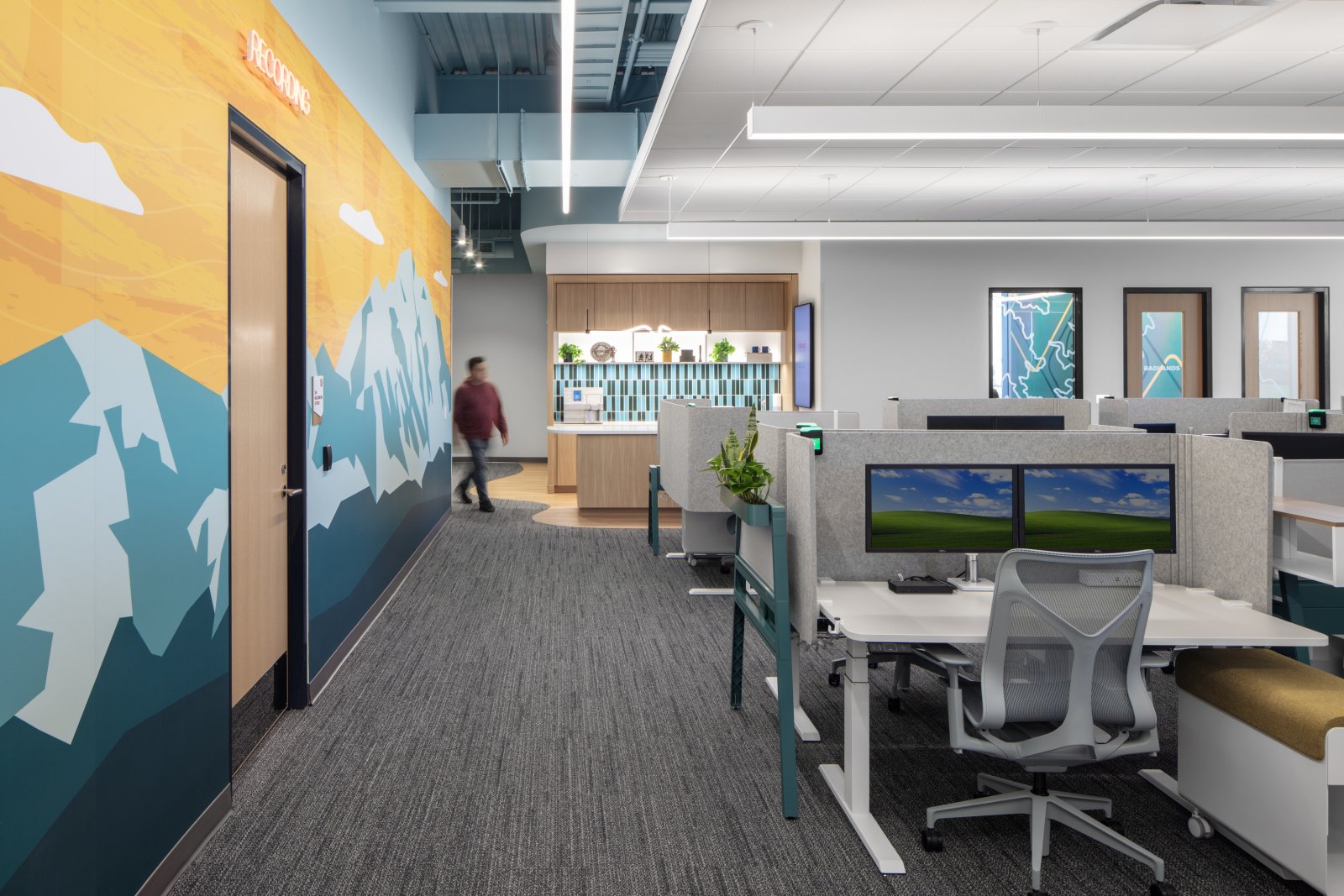 Employee wellness was a central focus throughout the design. Dedicated wellness and respite rooms feature specialized ventilation, lighting controls, and power systems to promote comfort, privacy, and well-being. Customized electrical and lighting solutions highlight unique themes on each floor, creating a distinctive and engaging workplace environment.