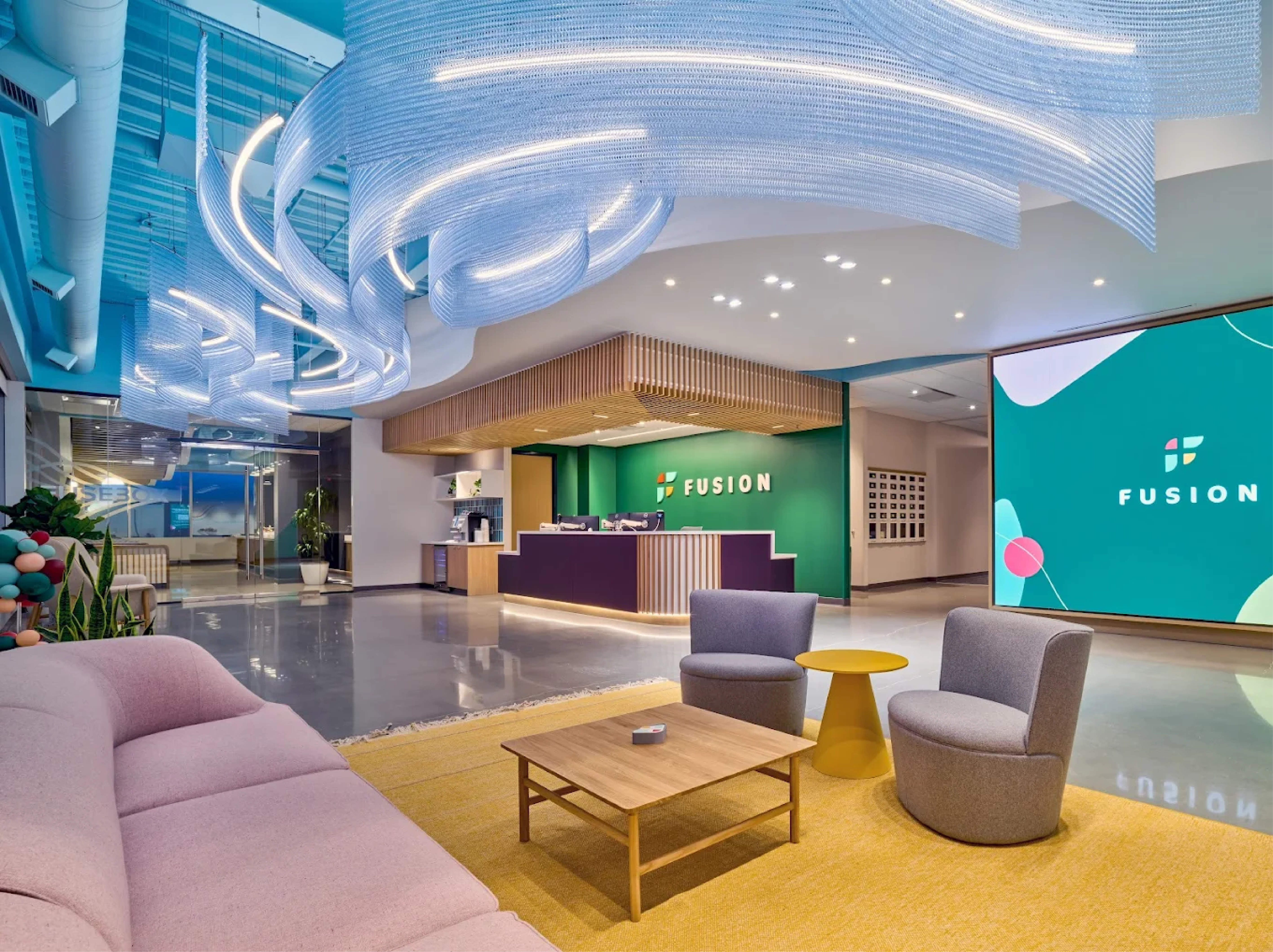 This 115,000-square-foot office renovation creates a dynamic, people-centric workplace tailored to Fusion's rapid growth and evolving hybrid work model.